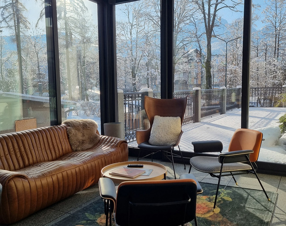 At Aparthotel Cristina, we have prepared an intimate workspace in the lobby with a view of the park and mountains.